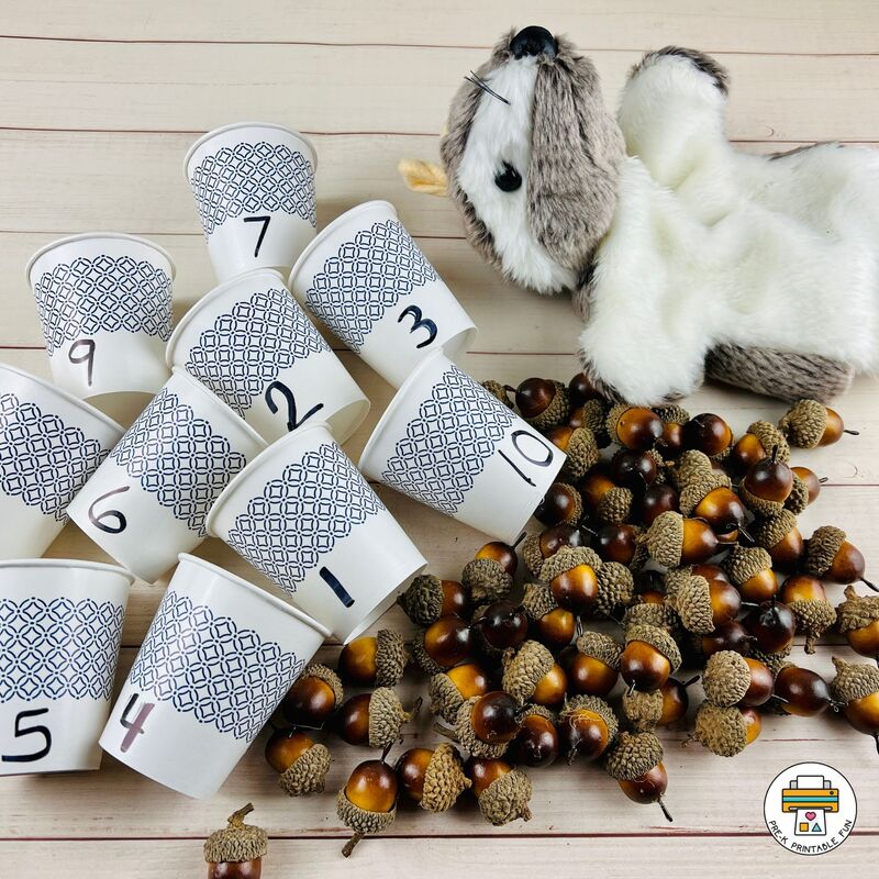 Make several nests throughout the house using large boxes, cushions, and so one. Assign each one a number and then look for the correct number of "acorns" (or pinecones, or beanbags, or play food) to store in each.